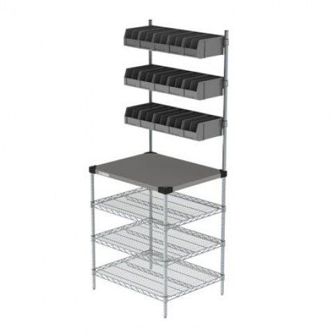 Drive-Thru POS & Staging Station, 30"W x 24"D x 74"H, solid 304 stainless steel top with corrosion resistant epoxy-coated corners, (3) adjustable under worktable wire shelves, includes (15) plastic overhead bins
