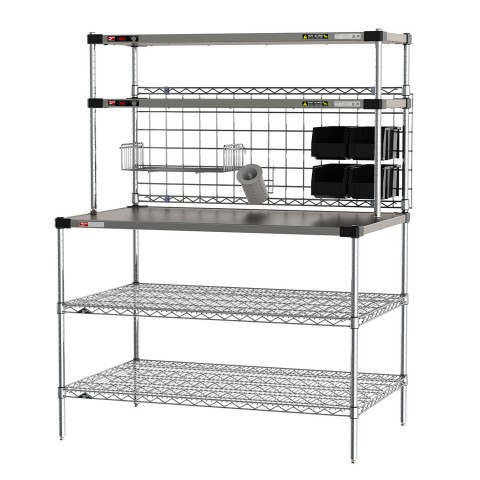Prep Workstation with Overhead Heated Shelves, (1) 48"W x 30"D reinforced stainless steel shelf, (2) 48"W x 30"D SuperErecta® wire shelves, (2) 48"W x 18"D Super Erecta® Hot Heated Shelves, adjustable thermostat to 200°F max temperature, 304 stainless steel construction, includes: (4) split sleeves, (4) 3" polymer feet for countertop use, 120v/60/1-ph, 400 watts, 3.4 amps, cord & NEMA 5-15P, NSF, cULus, Made in USA