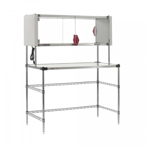 Super Erecta® Workstation with Hot Enclosed Heated Shelf, 3-sided open base, 48"W x 24"D stainless steel work surface, (1) 48"W x 14"D heated shelf, adjustable thermostat to 200°F max temperature, (1) overhead wire shelf, chrome plated wire & posts, 120v/60/1-ph, 400 watts, 3.4 amps, cord & NEMA 5-15P, NSF, cULus, Made in USA