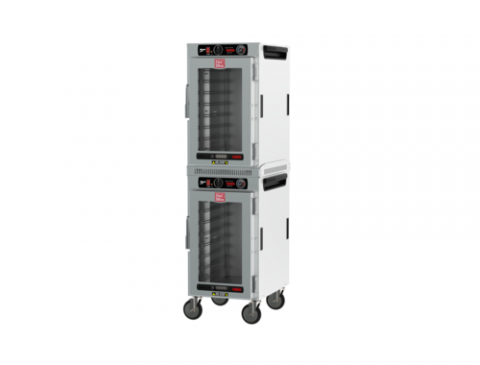 HotBlox™ Insulated Holding Cabinet, narrow (16) pan, stacked - dual cavity mobile, analog controls, clear door, holds full or half size steam pans or half size sheet pans, 5" casters, (2) 875 watts, (2) 120/60/1-ph, (2) cords with NEMA 5-15P, aluminum, (includes accessories), UL, NSF, Made in USA