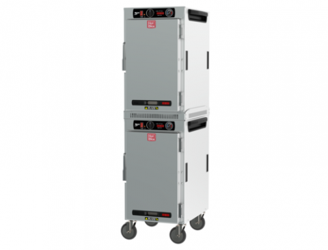 HotBlox™ Insulated Holding Cabinet, narrow (16) pan, stacked - dual cavity mobile, analog controls, solid door, holds full or half size steam pans or half size sheet pans, 5" casters, (2) 875 watts, (2) 120/60/1-ph, (2) cords with NEMA 5-15P, aluminum, (includes accessories), UL, NSF, Made in U.S.A.