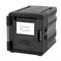 Mightylite™ Pan Carrier, front-load, insulated, (4) pan capacity, holds full, 1/2 & 1/3 sized pans in 2-1/2" to 8" depths, (8) integrated handles, stackable, elastomer travel latch, built-in door seal, label holder, includes bonus wire caddy, ultra-lightweight durable expanded polypropylene construction, black, NSF