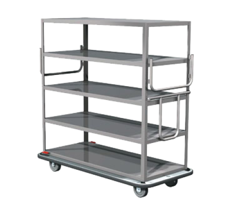 Queen Mary Cart, (5) ledged shelves, all welded 16 gauge stainless steel, swing-up handle, bumper, (4) 8" polyurethane casters 2 rigid/2 swivel, NSF