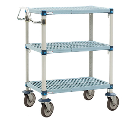 MetroMax® Q Utility Cart, 18"W x 30"D x 40"H, (3) open grid polymer mat shelves, polymer posts, 900 lb. capacity, with Microban® antimicrobial product protection, stainless steel handle (4) swivel rust resistant polymer casters with 5" (127mm) polyurethane wheels, KD, NSF