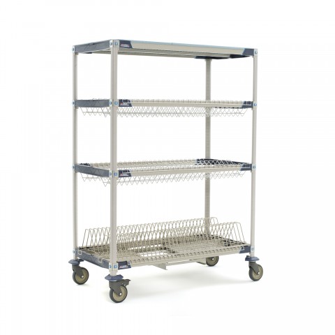 MetroMax® i Mobile Drying Rack Unit with Drip Tray, 48"W x 24"D x 68"H, 4-tier, for bulk drying & trays/cutting boards/sheet pans, includes: (3) open shelf frames, (1) shelf, (4) 63" mobile posts, (2) drop-ins, (1) cutting board/tray drying rack, (1) adjustable drip tray, (4) polymer swivel casters (2 with brakes), built in Microban® antimicrobial product protection, NSF