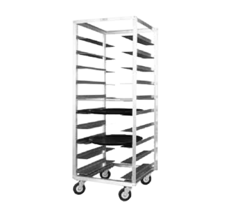 Oval Tray Rack, mobile, pass-thru, 27"W x 70-1/4"H, 29"D, open sides, 10 pan capacity with slides for 22-3/4" x 27-5/8" oval trays, slides on 6" centers, extruded aluminum construction, front & rear loading, 5"HD swivel casters (2) with brakes, neoprene wheels, NSF