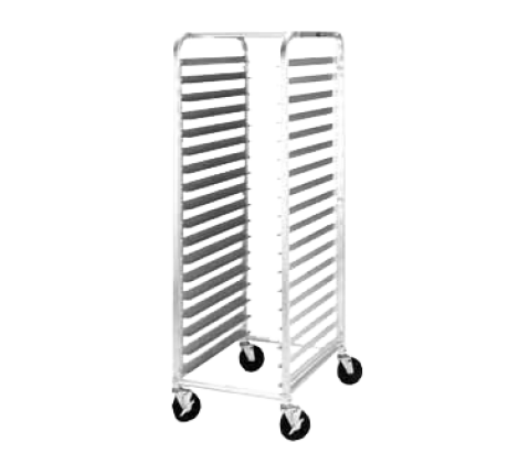 Pan Rack, mobile, end load, single section, 20-3/8"W x 64-1/8"H, 28"D, open sides, with slides for (34) 18" x 26" pans, slides on 1-1/2" centers, riveted tubular aluminum frame, 5" swivel casters (2) with brake, KD, NSF