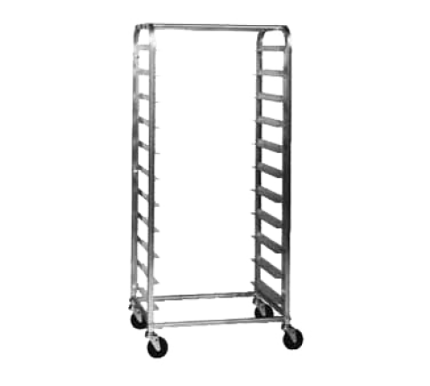Pan Rack, mobile, side load, 28-3/8"W x 64-1/8"H, 18-3/4"D, open sides, with slides for (11) 18" x 26" pans, slides on 5" centers, riveted tubular aluminum frame, 5" swivel casters (2) with brake, KD, NSF