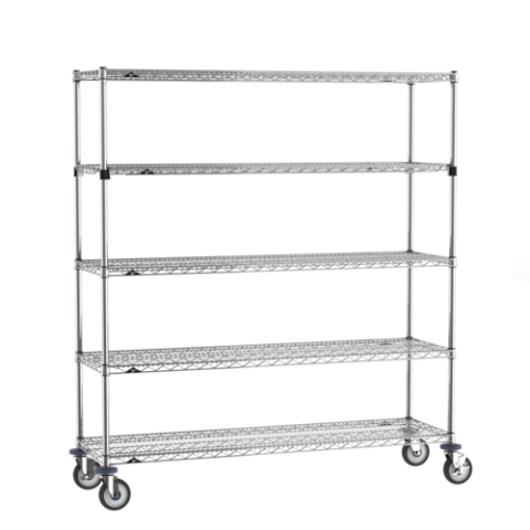 Super Erecta® Stem Caster Cart, 60"W x 18"D x 68"H, 5 tiers, (4) Super Erecta wire shelves, (1) EZ-ADD shelf, (4) posts, chrome plated finish, (2) swivel & (2) swivel/brake casters with polyurethane treads and chrome plated rigs, KD, NSF