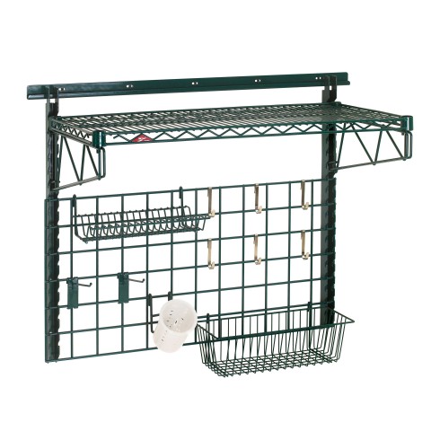 POS Sink Task Station Wall Shelving Kit, includes: (1 each) 40"Wall track, 18" x 36" Metroseal 3™ wire shelf & wire grid, wire basket, lid holder, utensil cylinder & cylinder holder (2 each) uprights, shelf supports & prong hooks (6) standard hooks, 400 lb. capacity per unit