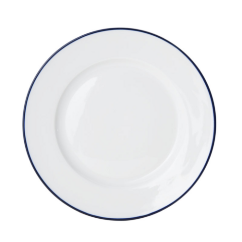 Bistro Plate, 9" dia., round, wide rim, dishwasher, microwave, freezer and oven safe, vitrified porcelain, white with blue band (must be purchased in case quantities)