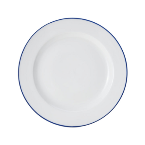 Bistro Plate, 12" dia., round, wide rim, dishwasher, microwave, freezer and oven safe, vitrified porcelain, white with blue band (must be purchased in case quantities)