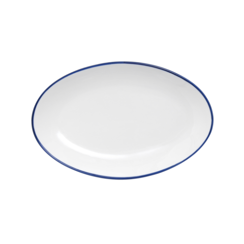 Bistro Entree Plate, 11-3/4"L x 7-1/2"W, oval, coupe, dishwasher, microwave, freezer and oven safe, vitrified porcelain, white with blue band (must be purchased in case quantities)