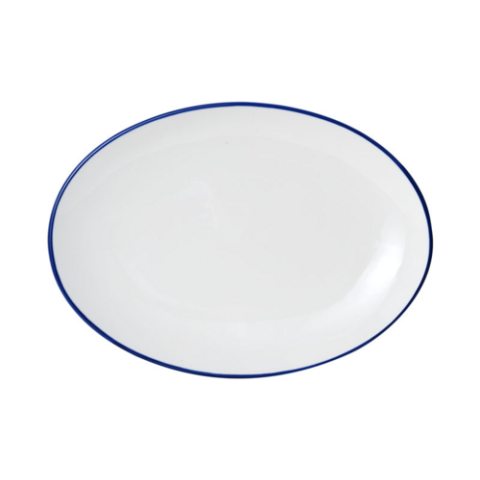 Bistro Entree Plate, 16"L x 11-3/5"W, oval, coupe, dishwasher, microwave, freezer and oven safe, vitrified porcelain, white with blue band (must be purchased in case quantities)