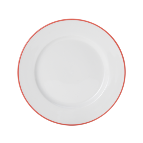 Bistro Plate, 8" dia., round, wide rim, dishwasher, microwave, freezer and oven safe, vitrified porcelain, white with red band (must be purchased in case quantities)