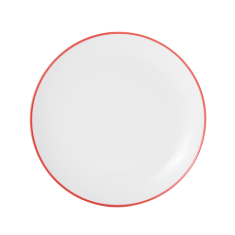 Bistro Plate, 8" dia., round, coupe, dishwasher, microwave, freezer and oven safe, vitrified porcelain, white with red band (must be purchased in case quantities)