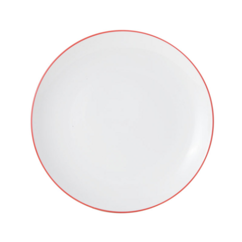Bistro Plate, 10" dia., round, coupe, dishwasher, microwave, freezer and oven safe, vitrified porcelain, white with red band (must be purchased in case quantities)
