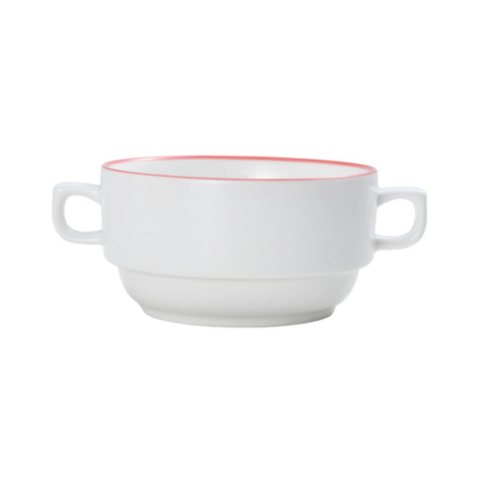 Bistro Soup Bowl, 14.87 oz., 4.9" dia., round, 6-1/2"L with handles, dishwasher, microwave, freezer and oven safe, vitrified porcelain, red (must be purchased in case quantities)