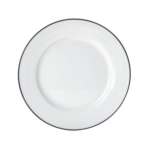 Bistro Plate, 8" dia., round, wide rim, dishwasher, microwave, freezer and oven safe, vitrified porcelain, white with black band (must be purchased in case quantities)