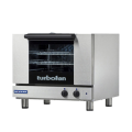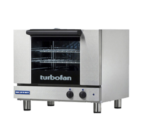 Turbofan® Convection Oven, electric, countertop, 21-3/4" assembled height, (3) 1/2 size sheet pan capacity, 2-5/8" tray spacing, manual controls, mechanical thermostat range 150 - 500° F, 60 minute timer, stainless steel front, sides and top exterior, pull-down twin pane glass door, porcelain interior, 3" adjustable stainless steel feet, cETLus, NSF