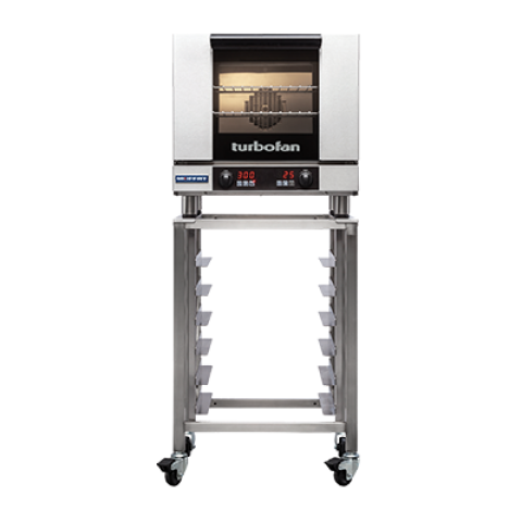 Turbofan® Convection Oven, electric, countertop, 23-7/8" assembled height, (3) 1/2 size sheet pan capacity, 3-1/3" tray spacing, digital display time & temperature controls, 20 programs, electronic thermostat range 150 - 500° F, electronic timer, includes (3) racks, stainless steel front, sides and top exterior, pull-down twin pane glass door, porcelain interior, 3" adjustable stainless steel feet