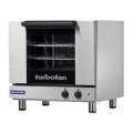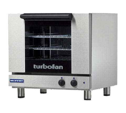 Turbofan® Convection Oven, electric, countertop, 23-7/8" assembled height, (3) 1/2 size sheet pan capacity, 3-1/3" tray spacing, manual controls, mechanical thermostat range 150 - 500° F, 60 minute timer, stainless steel front, sides and top exterior, pull-down twin pane glass door, porcelain interior, 3" adjustable stainless steel feet, cETLus, NSF
