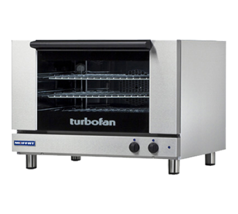 Turbofan® Convection Oven, electric, countertop, 27-7/8" assembled height, (3) full-size sheet pan capacity, 3-1/3" tray spacing, manual controls, mechanical thermostat range 150 - 500° F, 60 minute timer, stainless steel front, sides and top exterior, pull-down twin pane glass door, porcelain interior, 3" adjustable stainless steel feet, cETLus, NSF