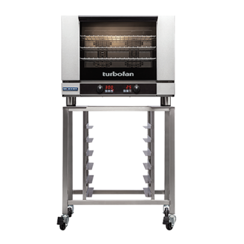 Turbofan® Convection Oven, electric, countertop, 26" assembled height, (4) full-size sheet pan capacity, 3-1/8" tray spacing, digital display time & temperature controls, electronic thermostat range 150 - 500° F, 20 programs, electronic timer, stainless steel front, sides and top exterior, pull-down twin pane glass door, porcelain interior, 3" adjustable stainless steel feet
