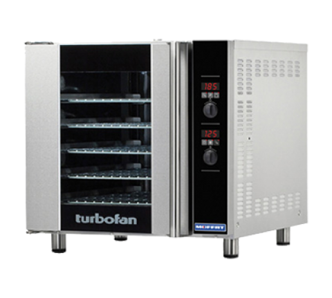 Turbofan® Convection Oven, electric, full-size, single-deck, 30" assembled height, 2 speed fan, digital display time and temperature controls, electronic thermostat control, temperature range 140 - 500° F, 3-1/3" tray spacing, 1-hour cook cycle timer & 3-hour hold timer, water injection, (5) full-size sheet pan capacity, antiskid adjustable stainless steel feet, rethermalization & roast functions, stainless steel exterior, with glass door, porcelain interior, ENERGY STAR®, cETLus, NSF