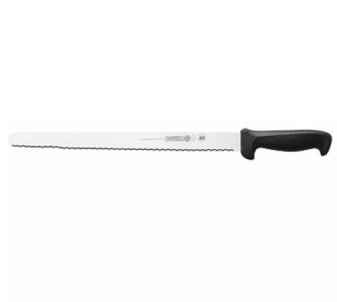 Slicer Knife, 14", serrated edge, 1-1/8" wide at handle, high carbon/no stain blade, molded black polypropylene handle, treated with sanitized antimicrobial protection (snap), NSF