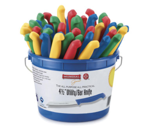 Utility/Bar Knife, 4-1/2", Serra sharp serrated, drop point, polypropylene handle, priced per 48-piece bucket, assorted colors: 12 of each color, yellow, red, green, and blue, NSF
