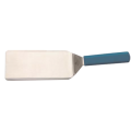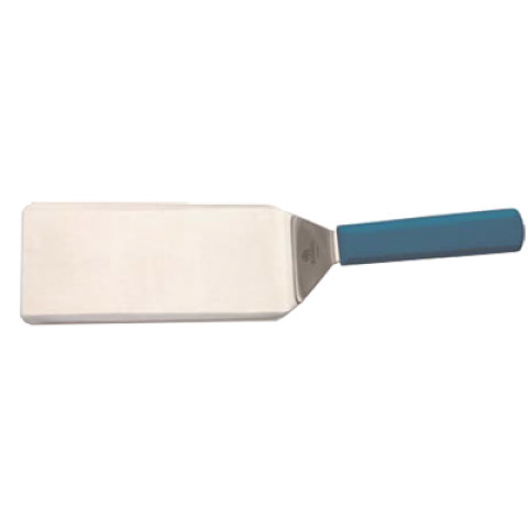 Turner, 4" x 8" x 15", beveled edges on two sides, stainless steel blade, blue polypropylene handle, withstands temperature up to 446°F, treated with sanitized anti-microbial protection, NSF