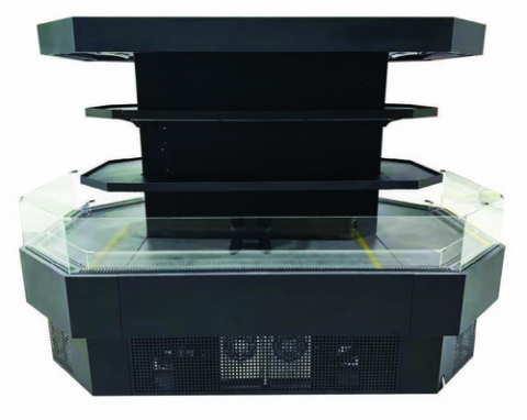Hydra-Kool Island Merchandiser, self-service, 98-2/5"W x 47-1/5"D x 57-1/10"H, self-contained refrigeration system, 35.6°F - 46.4°F temperature range, digital temperature controller & display, (2) tiers of adjustable black metal shelves, top & undershelf LED lighting, air deflector, insulated, R290 Hydrocarbon refrigerant, black metal base, interior & canopy, adjustable leg levelers, 208-230v/60/1-ph, 18.0 amps, cETLus, ETL-Sanitation