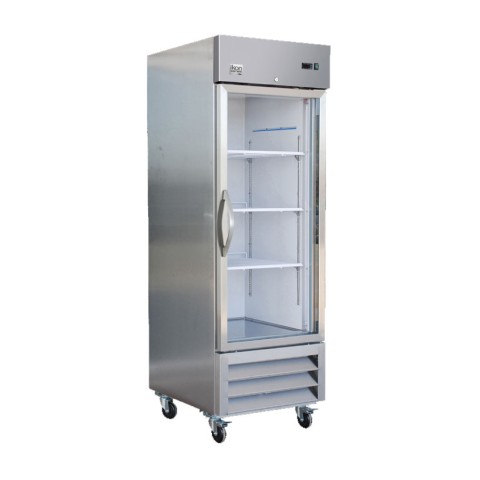 IKON Refrigeration Freezer, reach-in, one-section, bottom mount self-contained refrigeration, 19 cu. ft. capacity, 26-4/5"W x 31-9/10"D x 82-3/10"H, (1) locking glass door, (4) adjustable shelves, electronic thermostat, clip-on shelf tag holders, 0° to -10°F temperature range, digital LED temperature display, stainless steel interior & exterior, R290 refrigerant, 4" casters (2) braked, 1/2 HP, 115v/60/1-ph, 8 amps, cord, NEMA 5-15P, cETLus, ETL-Sanitation