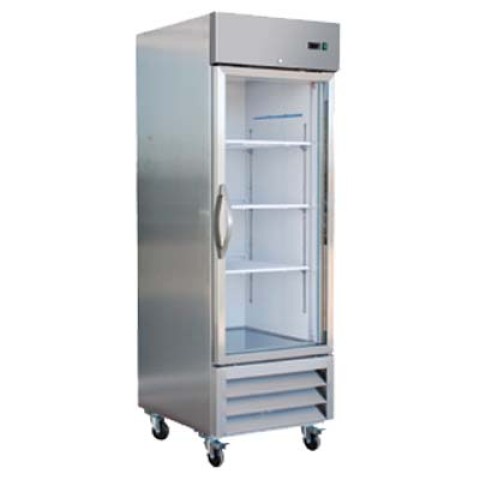 IKON Refrigeration Refrigerator, reach-in, one-section, bottom-mount self-contained refrigeration, 19 cu. ft. capacity, 26-4/5"W x 31-9/10"D x 82-3/10"H, (1) locking glass door, (4) adjustable shelves, accommodates full-size sheet pans, electronic thermostat, clip-on shelf tag holders, 33° to 40°F temperature range, digital LED temperature display, condensate evaporator, R290 refrigerant, stainless steel interior, stainless steel front & sides, 4" swivel casters (2) braked, 1/5 HP, 115v/60/1-ph, 3 amps, NEMA 5-15P, cULus, UL EPH