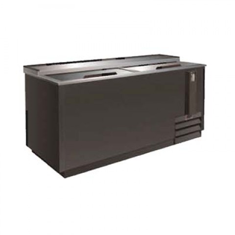 IKON Refrigeration Bottle Cooler, flat top, 13.5 cu. ft. capacity, 49-4/10"W x 27"D x 35"H, deep well, stainless steel top with rear raised glass rails, (2) sliding lids (lockable), electronic thermostat, 33° to 41°F temperature range, digital LED temperature display, (2) bin dividers, bottle opener with cap catcher, stainless steel interior, black exterior, side mounted self-contained refrigeration, R-600A refrigerant, 1" wheels, 1/2 hp, 115v/60/1-ph, 3 amps, cord with NEMA 5-15P, cETLus, ETL-Sanitation