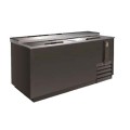 IKON Refrigeration Bottle Cooler, flat top, 17.2 cu. ft. capacity, 64-3/10"W x 27"D x 35"H, deep well, stainless steel top with rear raised glass rails, (2) sliding lids (lockable), electronic thermostat, 33° to 41°F temperature range, digital LED temperature display, (3) bin dividers, bottle opener with cap catcher, stainless steel interior, black exterior, side mounted self-contained refrigeration, R-600A refrigerant, 1" wheels, 1/2 hp, 115v/60/1-ph, 3 amps, cord with NEMA 5-15P, cETLus, ETL-Sanitation