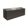 IKON Refrigeration Bottle Cooler, flat top, 26 cu. ft. capacity, 95-3/10"W x 27"D x 35"H, deep well, stainless steel top with rear raised glass rails, (3) sliding lids (lockable), electronic thermostat, 33° to 41°F temperature range, digital LED temperature display, (5) bin dividers, bottle opener with cap catcher, stainless steel interior, black exterior, side mounted self-contained refrigeration, R290 refrigerant, 1" wheels, 1/2 hp, 115v/60/1-ph, 3 amps, cord with NEMA 5-15P, cETLus, ETL-Sanitation