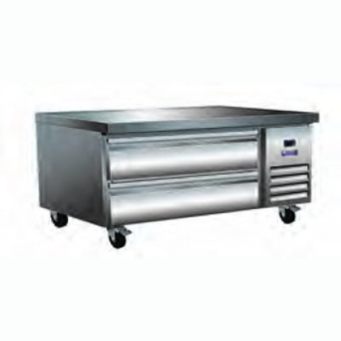 IKON Refrigeration Chef Base Refrigerator, 5.1 cu. ft. capacity, 38"W x 31-9/10"D x 26"H, (2) drawers, electronic thermostat, 33° - 40°F temperature range, digital LED temperature display, automatic defrost system, marine edge, aluminum interior with stainless steel floor, stainless steel top, front & sides, side mounted self-contained refrigeration, R290 refrigerant, 4" swivel casters (2) braked, 2.1 amps, 115v/60/1-ph, cord with NEMA 5-15P, 1/3 HP, cETLus, ETL-Sanitation