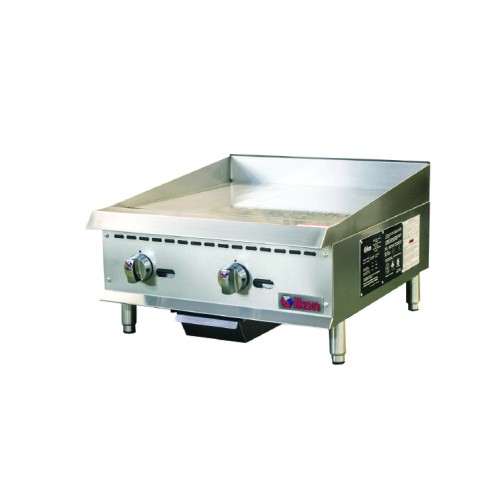IKON Cooking Griddle, natural gas, countertop, 24" W x 34.4" D, adjustable manual control, front lit pilot light, (2) 30,000 BTU U-shape burners, 3/4" polished steel griddle plate, (2) gas control knobs, double wall insulated sides, welded back & side splash guards, rear flue, removable 3-1/4" grease drawer with weep hole & baffle, 4" wide grease trough, stainless steel cabinet, stainless steel adjustable legs, non-skid feet, 60,000 BTU total, CSA-Sanitation, CSA Star, CSA Flame (ships with LP gas conversion kit)