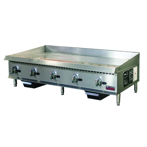 IKON Cooking Griddle, natural gas, countertop, 60" W x 34.4" D, adjustable manual control, front lit pilot light, (5) 30,000 BTU U-shape burners, 3/4" polished steel griddle plate, (5) gas control knobs, double wall insulated sides, welded back & side splash guards, rear flue, removable 3-1/4" grease drawer with weep hole & baffle, 4" wide grease trough, stainless steel cabinet, (6) stainless steel adjustable legs, non-skid feet, 150,000 BTU total, CSA-Sanitation, CSA Star, CSA Flame (ships with LP gas conversion kit)