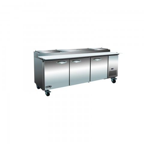 (SPECIAL ORDER) IKON Refrigeration Pizza Prep Table, three-section, 94-1/5"W x 32-1/3"D x 41-7/10"H, stainless steel raised pan rail accommodates (12) 1/3 GN pans (included), removable polyethylene cutting board, (1) solid hinged door, (1) adjustable shelf, (4) drawers, electronic thermostat, 33° - 40°F temperature range, digital LED temperature display, automatic defrost, interior: 304 stainless steel floor, aluminum back wall, ABS side walls & door backs, stainless steel top, front & sides, side mounted self-contained refrigeration system, R290 refrigerant, 4" casters (2 braked), 3/4 HP, 115v/60/1-ph, 5.5 amps, cord with NEMA 5-15P, cETLus, ETL-Sanitation