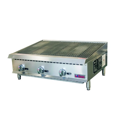 IKON Cooking Radiant Broiler, natural gas, 36" W x 34.4" D, (3) 35,000 BTU 'U' shape burners, 10 gauge cast iron radiants, rear flue, adjustable manual controls, 3-position cast iron grates, front lit pilot light, double wall insulated sides, back & side splash guards, removable full width crumb tray, rear gas regulator, stainless steel cabinet, adjustable stainless steel legs, non-skid feet, 105,000 BTU total, CSA-Sanitation, CSA Star, CSA Flame (ships with LP gas conversion kit)