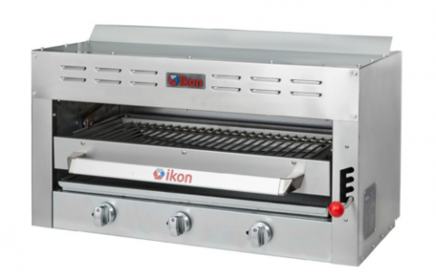IKON Cooking Salamander Broiler, natural gas, 36"W, (3) infra-red 13,000 BTU burners, manual control, 4-position adjustable spring balanced rack with ball grip handle, standing pilot ignition system, stainless steel exterior, pressure regulator, 45,000 BTU total, CSA Flame, CSA Star, CSA-Sanitation (ships with LP conversion kit)