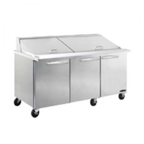 IKON Refrigeration Mega Top Sandwich / Salad Prep Unit, three-section, 18 cu. ft. capacity, 71-7/10"W x 34-1/2"D x 43-1/5"H, stainless steel top with opening for (27) 1/6 pans (included), (3) solid hinged doors, (3) adjustable shelves, removable cutting board, electronic thermostat, 33° - 40°F temperature range, digital LED temperature display, automatic defrost, interior: 304 stainless steel floor, aluminum back wall, ABS side walls & door backs, stainless steel front & sides, 2-1/2" swivel casters (2) braked, rear mounted self-contained refrigeration system, R290 refrigerant, 1/2 HP, 115v/60/1-ph, 4.3 amps, NEMA 5-15P, cULus, UL EPH