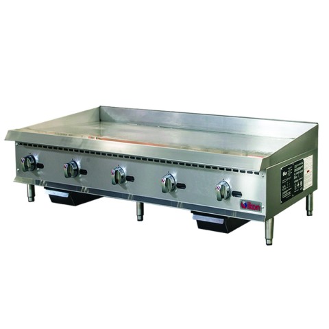 IKON Cooking Griddle, natural gas, countertop, 60" W x 34.4" D, adjustable manual thermostatic control, front lit pilot light, (5) 30,000 BTU U-shape burners, 1" thick polished steel griddle plate, (5) gas control knobs, double wall insulated sides, welded back & side splash guards, rear flue, removable 3-1/4" grease drawer with weep hole & baffle, 4" wide grease trough, stainless steel cabinet, (6) stainless steel adjustable legs, non-skid feet, 150,000 BTU total, CSA-Sanitation, CSA Star, CSA Flame (ships with LP gas conversion kit)