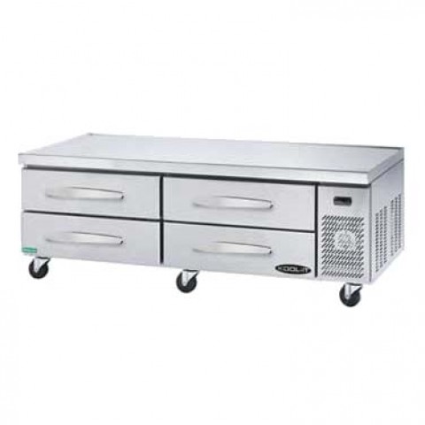 Kool-It Signature Chef Base Refrigerator, 74-1/8"W x 30-1/2"D x 25-1/2"H, solid stainless steel top with marine edge, (4) drawers, (8) full size pan capacity, 33°F to 39°F temperature range, digital temperature display, stainless steel front, sides & interior, 5" swivel casters with (2) locking, side mounted self-contained refrigeration, R290 refrigerant, 1/5 HP, 115v/60/1-ph, 3.0 amps, cord, NEMA 5-15P, cETLus, ETL-Sanitation