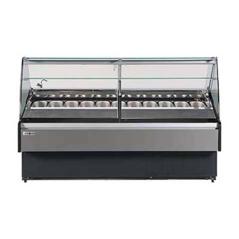 Hydra-Kool Gelato Case, service type, multiplexible, 40-3/8"W x 43-3/8"D x 48-7/8"H, (10) pan capacity, -4/-7°F temperature range, digital controller, lift up curved front tempered glass, tempered glass sides, rear tempered sliding glass doors, stainless steel interior, interior lighting, 7-3/4"D top sill, 7-3/4"D rear work shelf, PVC coated silver & black exterior, self-contained refrigeration, adjustable feet, cETLus, ETL-Sanitation
