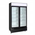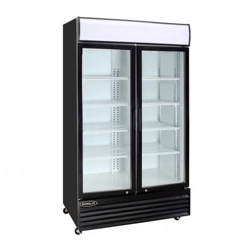 Kool-It Refrigerated Merchandiser, 37.1 cu. ft., 52-3/10"W x 28-2/5"D x 79-1/2"H, (2) hinged locking glass doors, hinged on right, 33° to 40°F temperature range, digital thermostat with LED display, white baked enamel interior with (8) adjustable shelves, interior LED lighting, top lighted signage panel, black powder-coated exterior, bottom mount self-contained refrigeration, R290 refrigerant, (4) casters, 1/4 HP, 115v/60/1-ph, 3.3 amps, cord with NEMA 5-15P, cETLus, ETL-Sanitation