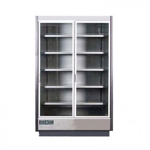 (SPECIAL ORDER) Hydra-Kool High Volume Refrigerated Merchandiser, reach-in, multiplexable, 51-1/2"W x 32-11/64"D x 87-53/64"H, (2) hinged glass front doors, retractable night curtain, PVC coated gray steel interior with (5) adjustable shelves, 32°-40°F temperature range, digital controller, LED lighting in canopy & under each shelf, PVC coated silver steel front panel, gray kick plate, designed for remote refrigeration, adjustable feet, ETL-Sanitation, cETLus
